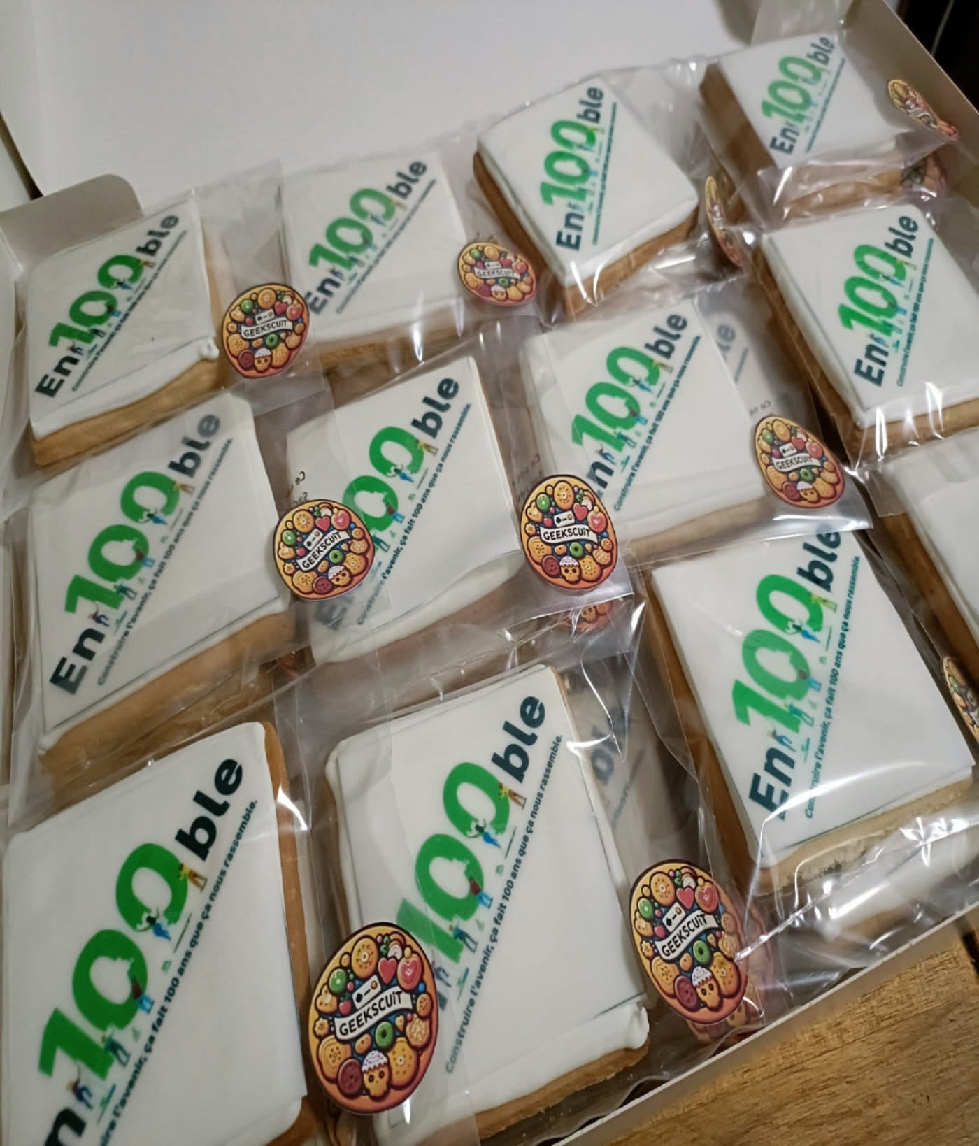 À l'occasion du centenaire de Leroy Merlin, nous avons eu le plaisir de réaliser une commande spéciale de biscuits personnalisés. Chaque biscuit a été minutieusement décoré avec le logo officiel des 100 ans, pour offrir aux invités une touche gourmande et élégante lors de cet événement d'exception.